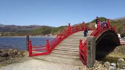 日本三大霊場 恐山に着きました。三途の川がお出迎え。 俗界と霊界を分ける赤い太鼓橋。 ※三大霊場・・比叡山、高野山、恐山 |