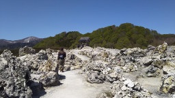 最後にせっかくなんで、恐山温泉に入りました。小さい木の浴槽が二つです。中々、気持ち良かった。 |
