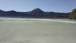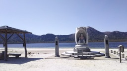 極楽浜。白砂の浜で、コバルトブルーの湖水がキレイ。砂浜には、花がお供えしてありました。 |