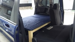 窓全面を専用のシェードで覆い、2列目、3列目にコンパネを敷きました。自分の身長より十分広いので、快適です。 |