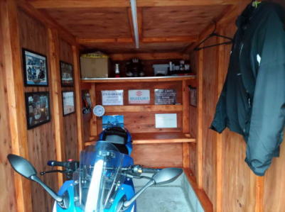 男の隠れ家に憧れてやっと完成しました。狭いですが、1人で作業が出来る様に取り外し可能なテーブルを付けて、自分のショップ風にアレンジしてみました。バイクを出してバーベキューのテーブルも置いてみたら、何とか飲み会も出来そうです。
