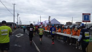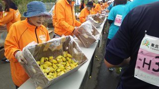 | これがエイドステーションです。19か所あり、給水所や、食べ物がある所があります。まさかの↑のトイレのロスの為に、キュウリの漬物と、はらこ飯だけ食べ損ねました。 | |