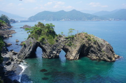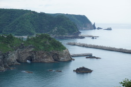 | 碁石海岸の宣材写真になっている「穴通磯」。次は釜石の大観音に行く予定でしたが、古いナビにより案内もいまいちでそのまま三陸道を使い浄土ヶ浜を目指しました。途中の「道の駅三陸にてご飯と柿ソフトクリーム(日本初?)を食べました。 | |