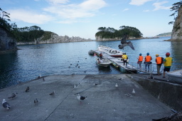 | 受付はまぁまぁぎりぎりでしたが、間に合いました。乗るまでの間、カモメと戯れです。サービスで貰ったかっぱえびせんにウミネコが群がってきます。ウミネコも人に恐怖心もなく簡単に近くに寄ってくるので、パシャリ。 | |