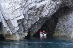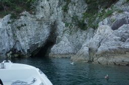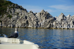 | 船の船頭が色々説明しながら「青の洞窟」へ。ウミネコも道案内(笑) | |