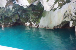 | 光の関係で、水が青っぽく見える。あとは戻りです。約20分程度の船旅でした。 | |