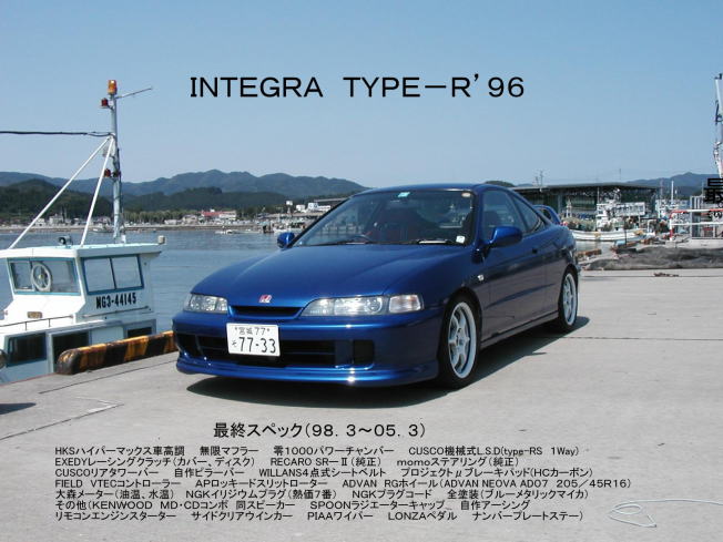 1代目アルト→2代目シビックと乗り継いで、3代目がこのインテです。この車のおかげで車いじり、走る事の楽しさを学んだと思います。維持費等の都合により乗り換えましたが、また機会があればホンダのVTECエンジンを堪能したいです。いつか、きっと・・。