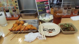 種類が豊富で分からなかったので、セットメニュー「道頓堀セット」を注文。サクサクの串焼きと土手焼きが超美味しい。 |