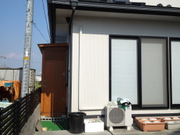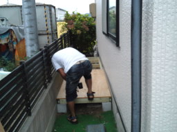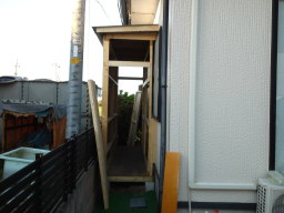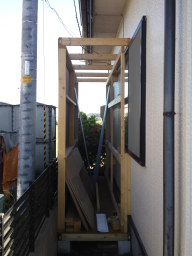 | 家の左脇のスペース、およそ90cmしかありません。小さく作っても意味が無いので高さと長さを最大限に使おうと考えました。 協力者は、昔大工だった弟。 |