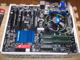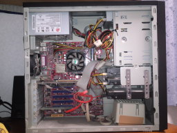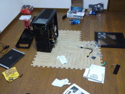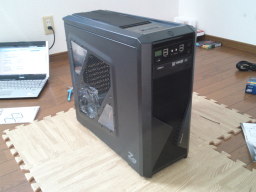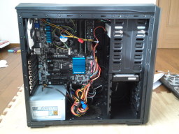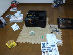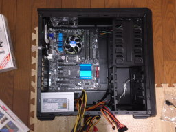 | PCケースにマザーボードを組み込みました。とりあえず山場は超えた。あとは電源を固定。 | |