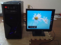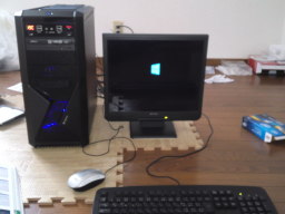| さて・・電源をいれてみよう。 ドキドキ・・・。 おっ、画面にwindows8のマークが。 問題無いようで一安心。 4つファンがブルーに光り、カッコイイ。 |