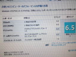 | スコア。 画面が小さくて見えずらいですが、プロセッサ8.0、メモリ8.0、グラフィックス6.5、ゲーム用グラフィックス6.5、プライマリハードディスク7.8です。 CPUとSSDはやっぱり大きいですね。内蔵グラフィックで6.5は十分な気がします。 起動は15秒。シャットダウン10秒。 納得のスペックになりました。 10年は使うぞ〜!!! パソコン更新履歴へ→ |
