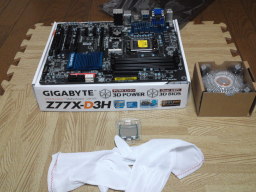 | 手袋を付けて、作業開始。 まずはマザーにCPUを組み込むんですが緊張のあまり手が震えます。 簡単な作業ではあるけど、一番の山場です。なんせ、CPUが今回の予算の半分近くを占めてますからw。失敗は許されません。 |