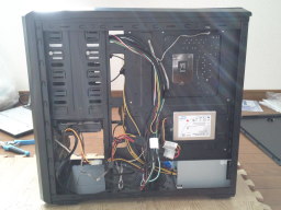 | 全面からドライブを組み込み、旧メイン機からのハードディスクも組み込みました。あとは、コネクタ類を接続。 ゲーム向けのケースだからか右側面がスケルトンなので、見栄えよく配線も整えました。 |
