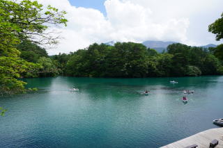 平成29年9月19日 五色沼湖沼群(毘沙門沼) お勧め度:★★★★ 五色沼湖沼群の7つのうちの1つ毘沙門沼に行きました。沼の色はエメラルドグリーンでキレイでした。若干天気が回復したので、初の手漕ぎボートに乗りました。