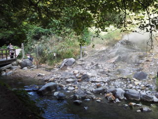 写真の孫六温泉の所に橋があり、右側を見るとちょっとした滝があり、マイナスイオンを浴びれます。本日は天気も良く、川が見える露天風呂は最高でした。