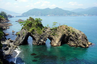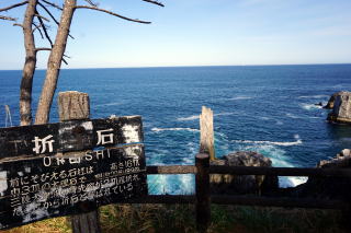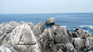 平成31年4月29日 巨釜半造 お勧め度:★★ 住所:宮城県気仙沼市唐桑町小長根 大理石の海蝕による奇岩が連続する所らしいです。景色はキレイです。あの中央に見える縦長の岩が折石です。