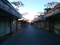 | 仲見世通り。本当は店、人が多くて賑わっているんですが、まだ開店前です。残念ながら時間の関係で見る前にバス移動です。 | |
