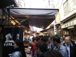 | 築地場外市場です。狭い路地にいっぱいの店が立ち並んでいます。メインは海産物ですが、それだけではなく、色々な店があります。 | |