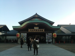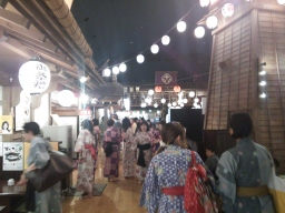 | 最後に行った場所は、「大江戸温泉物語」という温泉施設。温泉のテーマパークで、浴衣に着替えて中に入ると、出店や屋台がたくさんあり街並みが江戸っぽいです。食事する所も色んなテナントが入っていてかなり充実していました。ここは一日がかりで遊ぶ場所のようです。自分達は温泉に入って疲れを取りました。 | |