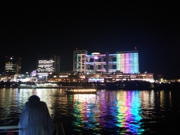 | 屋根の上から360度の景色を堪能できます。今回の旅行でこの屋形船の夜景が一番良かったかも。 写真はフジテレビ。夜はカラフルになり、電飾で色々な映像が流れます。 |